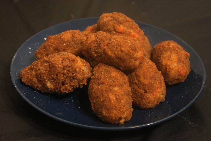 9) Панируем в последовательности мука-яйцо-сухари. С любовью похлопываем каждую котлетку, чтобы панировка держалась более плотно. После того как всё сформовали, убираем котлетки ненадолго в холодильник, ставим разогреваться фритюр.