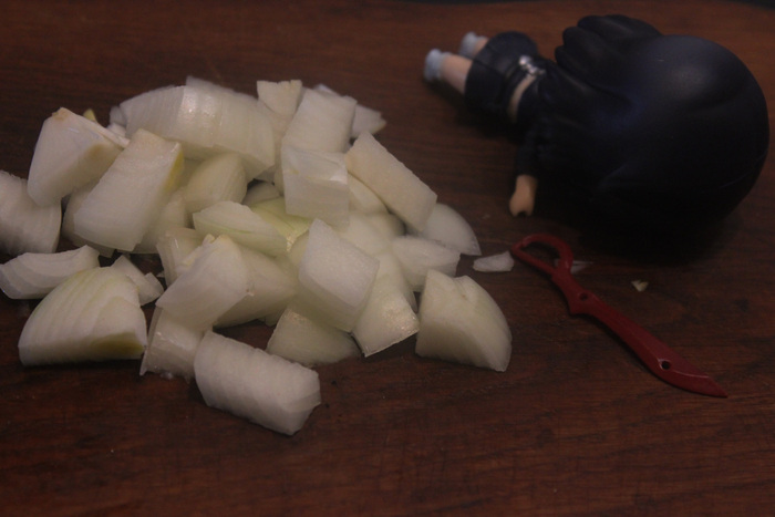 3) Лук нарезаем также как и морковку. Стараемся не плакать.