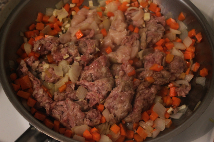 5) К овощам добавляем на обжарку мелкорубленный чеснок фарш, куриное филе, также порезанное кубиками. Солим, перчим, не забываем помешивать. Спустя пару минут добавляем соевый соус, выпариваем его, помешивая до готовности мяса. Параллельно из готовой картошки делаем пюре.