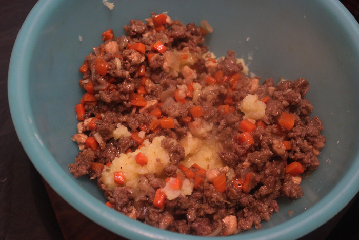6) Смешиваем пюре с начинкой и даём остыть. Затем равномерно перемешиваем.