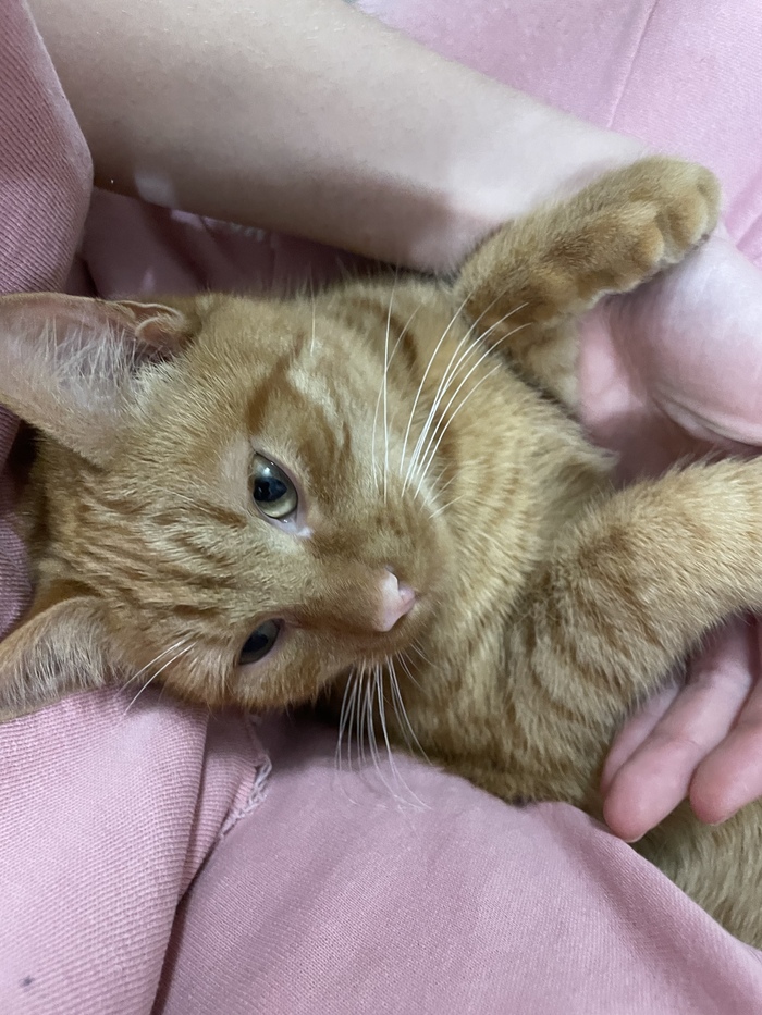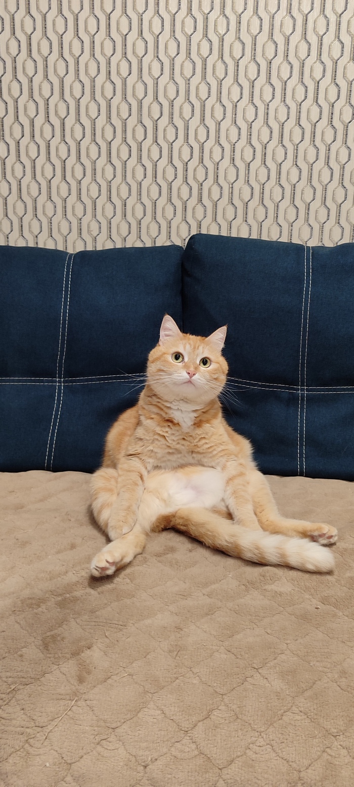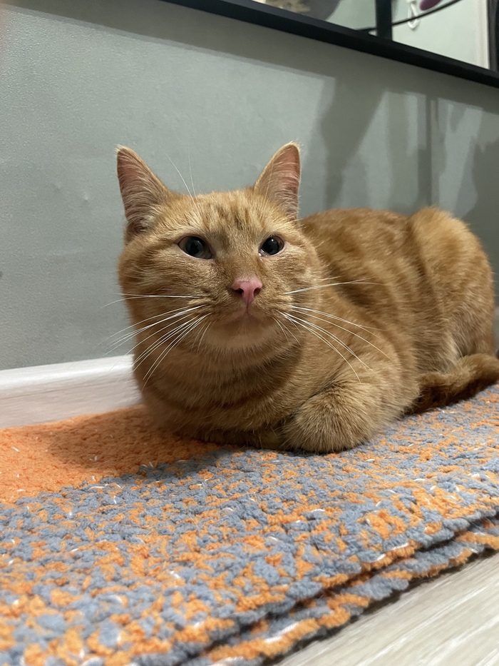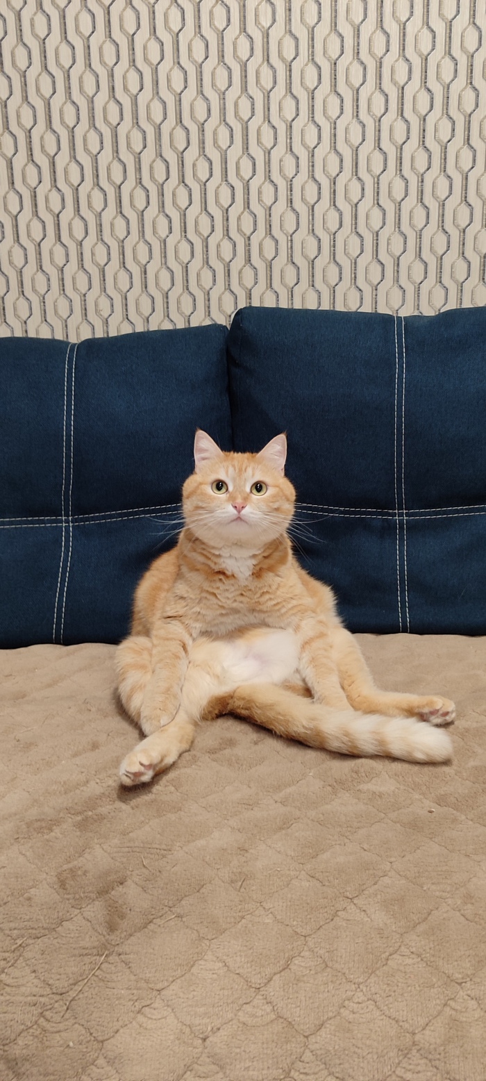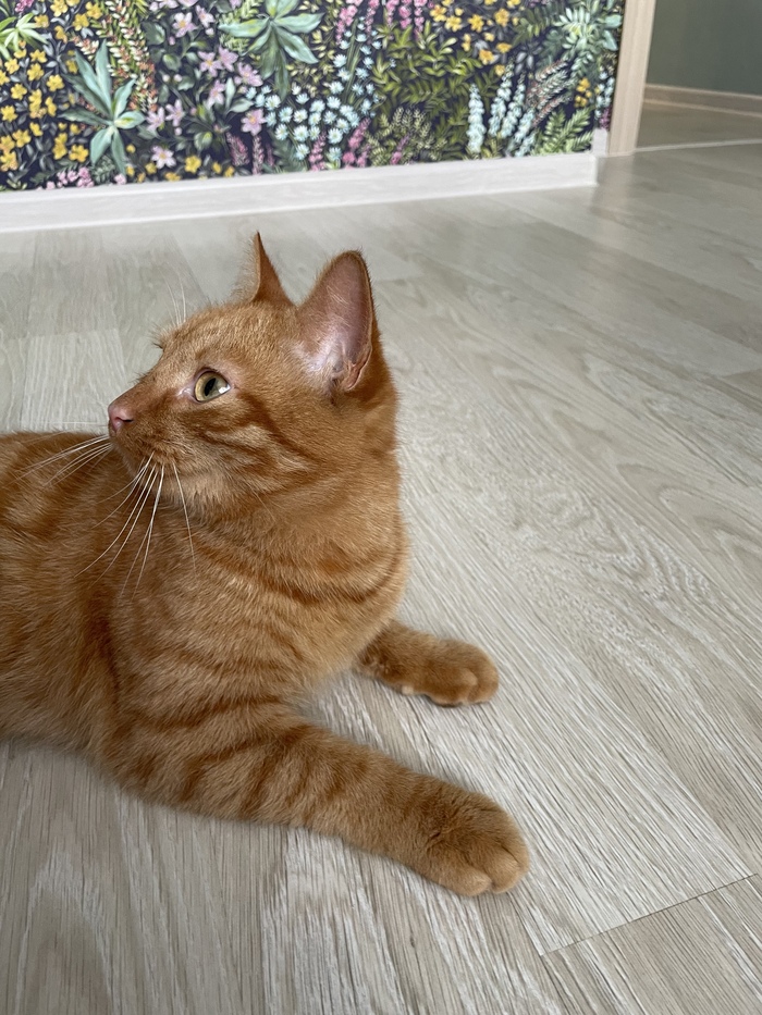Он очень тактильный и ласковый, игривый, молодой. Ведет себя воспитанно, тихий. Мурчит, как паровоз.