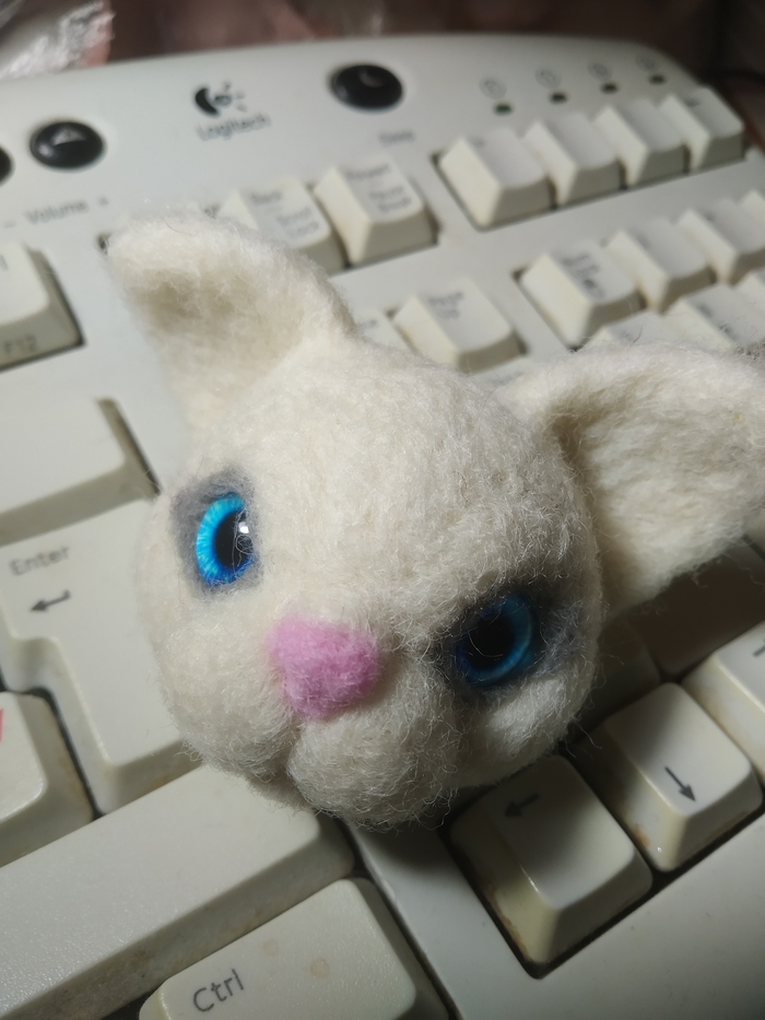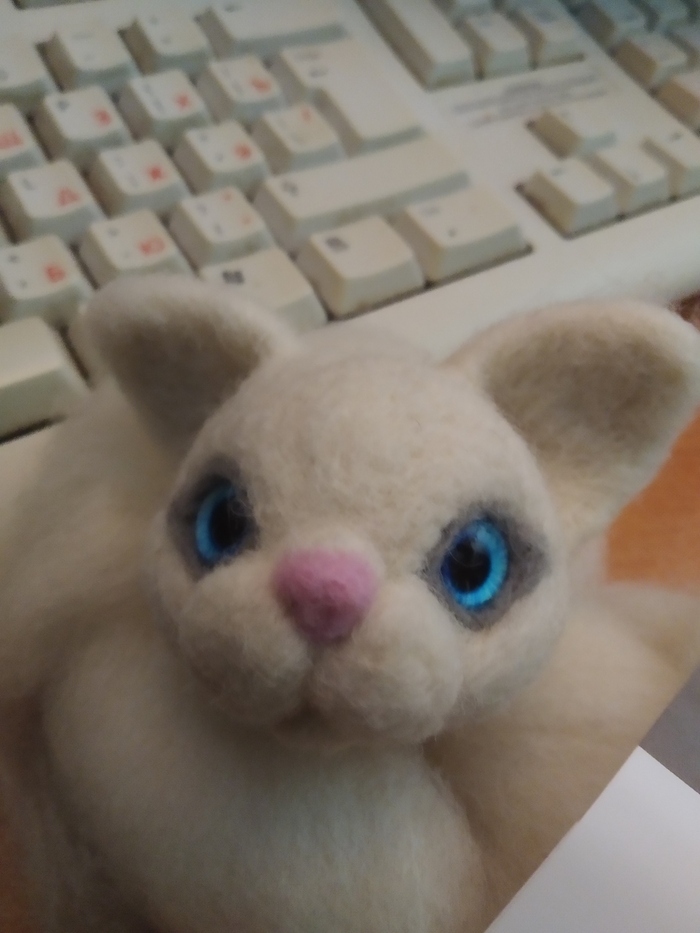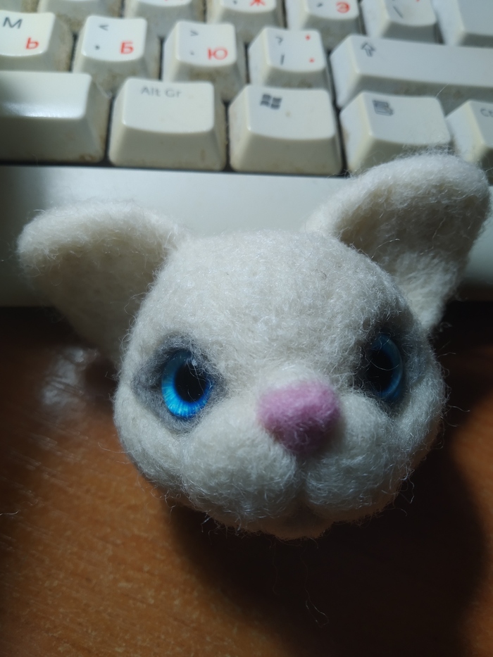 Сделана из шерсти, участие принимали кабошоны и конский волос. Я старалась, чтобы кошка была похожа на кошку.