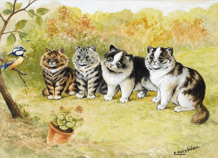 Луис Уильям Уэйн (1860–1939) с детства любил рисовать животных. Он подолгу наблюдал за ними, изучал их повадки, характер. А потом… Всё началось с чёрно-белого кота Питера, подобранного во время прогулки. Развлекая больную жену Эмили, художник рисовал для неё забавные картинки: Питер в очках, с утренней газетой в лапах, Питер-гуляка в шляпе, с тростью… Эмили понравились рисунки и она посоветовала отнести их в издательство. За несколько дней до её смерти, незадолго до Рождества, лондонский журнал напечатал картинку с изображением котят в рождественский, праздничный вечер. Тогда, во времена правления королевы Виктории, подобное творчество считалось весьма необычным. Кошки занимаются человеческими делами - это невероятно! Рисунки вызвали у почтенных, чопорных англичан вначале изумление, затем восторг.