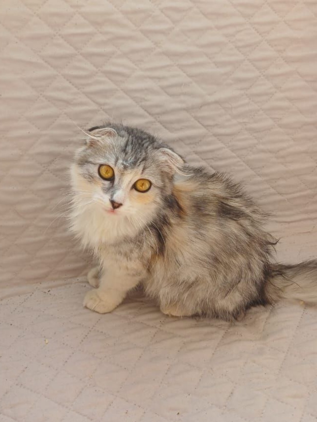 Малышку нашли на улице, временно приютили. Девочка вислоухая, пушистенькая, очень необычного серебристо-трехцветного цвета.