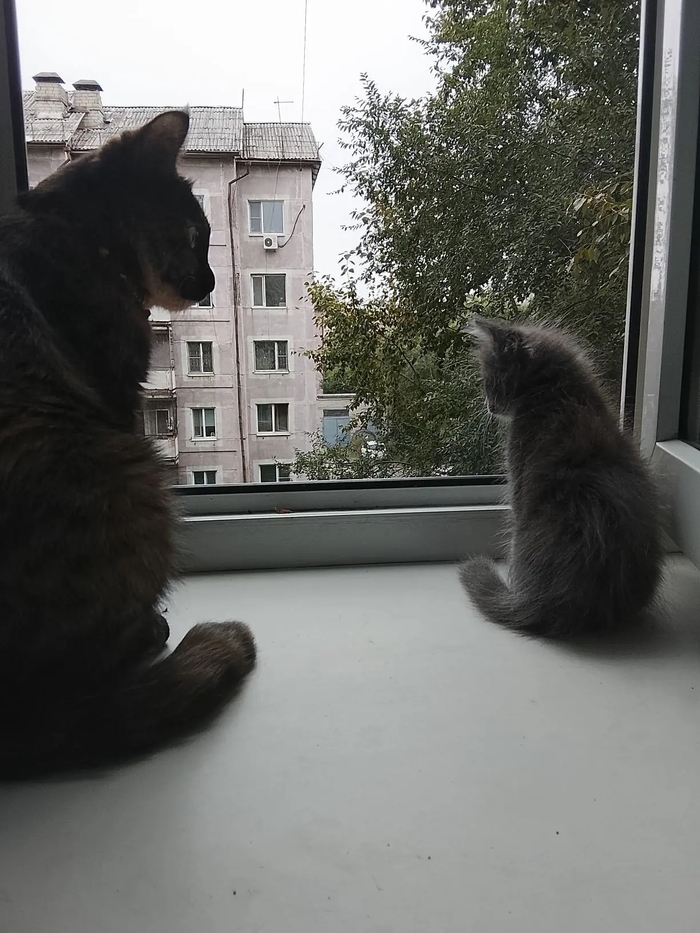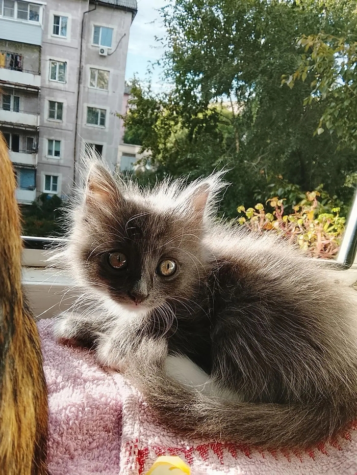 Пять котят выбросили на помойку летом 2025 года, дети нашли их, одного мы забрали, так как наша кошка Томара Васильевна в это время была с молоком но без котёнка который родился мертвый, был весь белый и один котейка у неё.