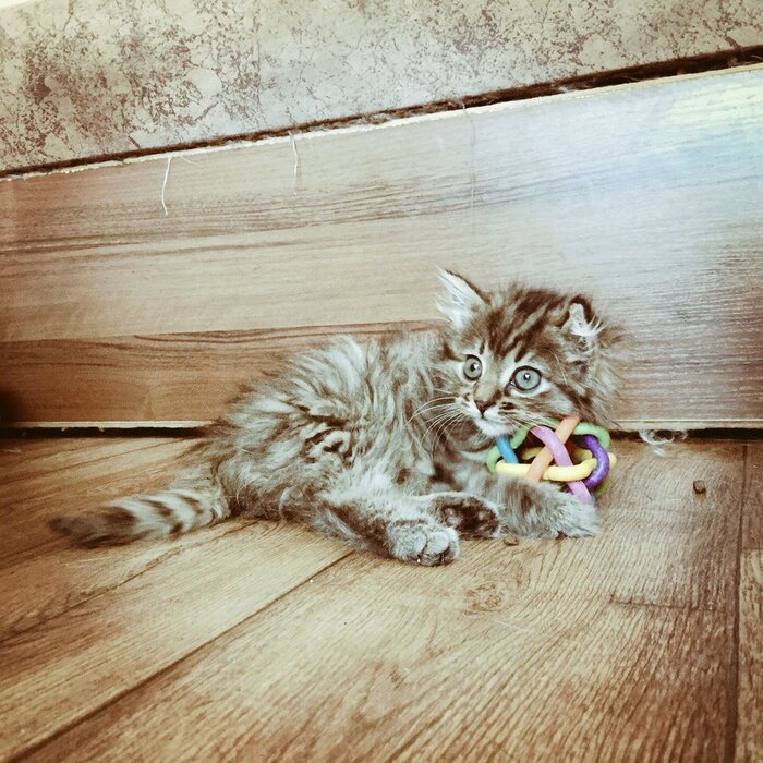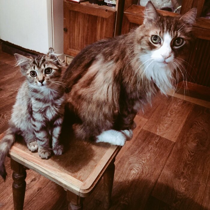 Малышка Лукерья с нашим Гошей, он тоже, кстати, подобранец. У бабули, которой я в то время помогала с кошками, умерла соседка, а кота некуда или некому... Да неважно это... Она мне позвонила, деваться некуда, жалко кота, а выбросить возрастного почечного на улицу это верная, да мучительная смерть...