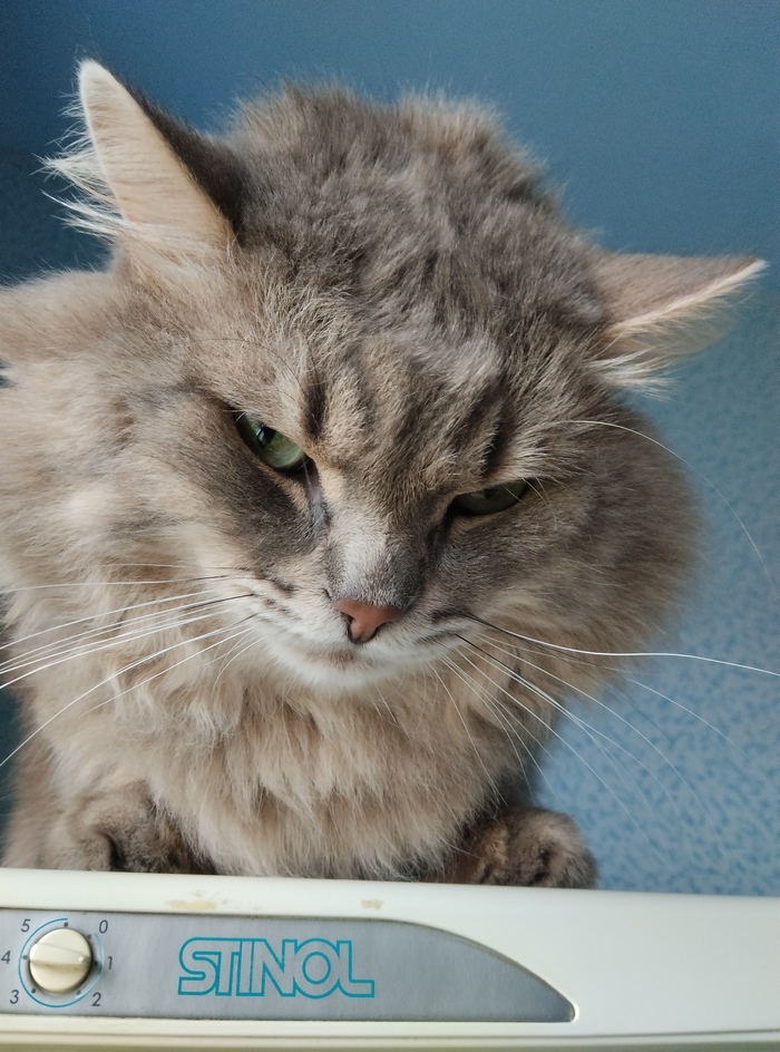 Постригли бедолагу. Обиделся. А обижается Герасим всегда на печке, может весь день там просидеть вот так, попцом к обидчикам) Глазки я так, для пущего драматизьму пририсовала. Оригинал сгинул вместе со старым телефоном, а этот глазастый жоп выжил где-то в недрах тг ) Ну и по традиции: жопа с глазами - "синма сітан". Мягкая "с" читается как "щ", ударение всегда на первой слог.