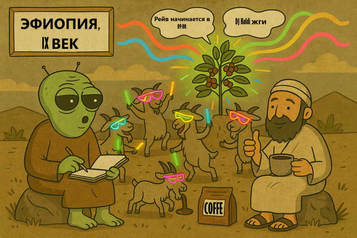Пастух Калди в IX веке (регион Каффа, Эфиопия) заметил, что его козы жрут красные ягоды и устраивают техно-рейв: прыгают, бодрят вселенную, ведут себя как старые смартфоны после перепрошивки. Калди: «Если козам норм — я тоже попробую». И так человечество встало на путь утреннего допинга. Калди, ты супер.