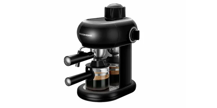 Открывает рейтинг недорогая компактная кофеварка REDMOND RCM-1521, отличающаяся от других участников низким уровнем создаваемого давления – всего 4 бара. Поэтому истинным гурманам она не подойдет. В остальном же модель радует оснащением – это и надежный двигатель мощностью 800 Вт, и ручной капучинатор для вспенивания и подогрева молока.
