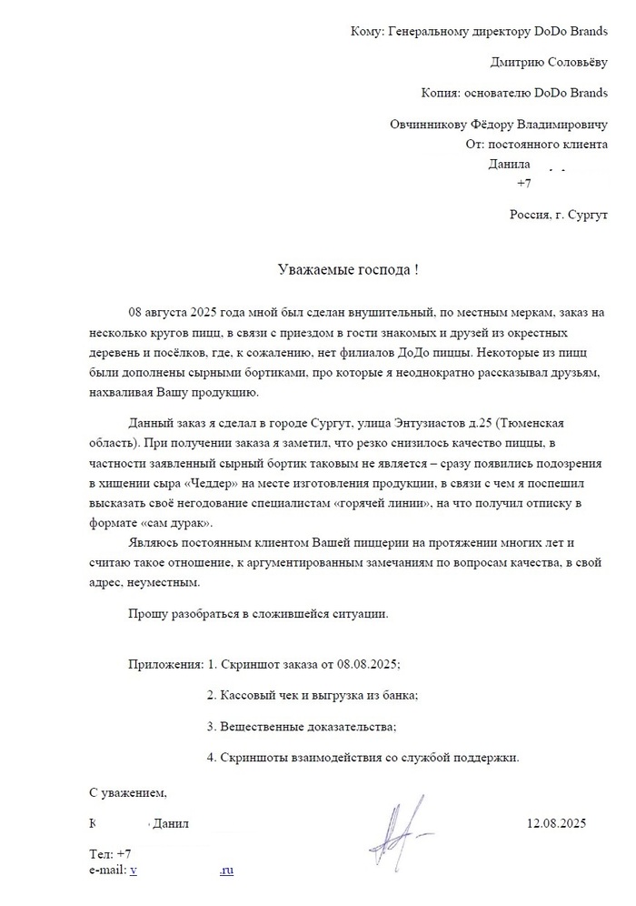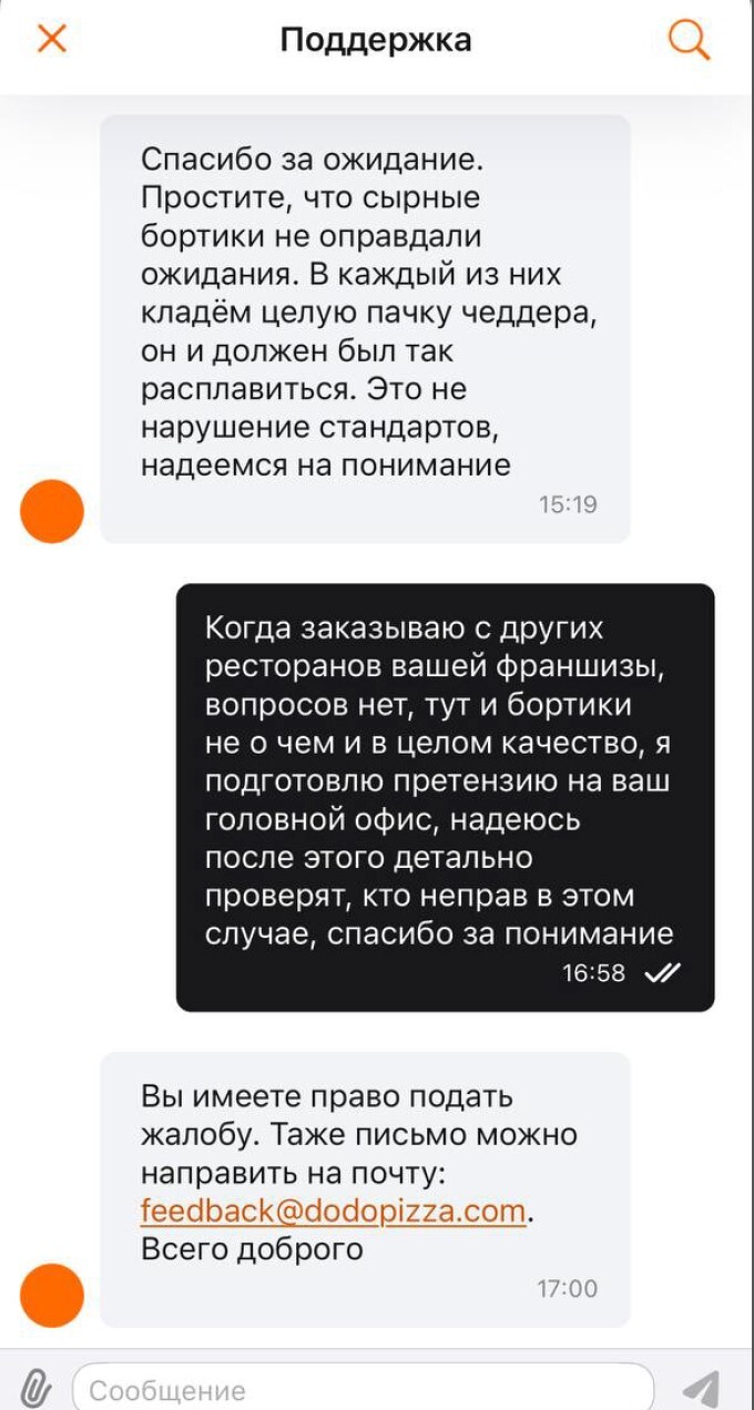 Обратился ко мне за помощью, а я написал письмо в адрес руководства Додо + в копию поставил фидбек, на что сегодня получили ответ с почты feedback@dodopizza.com в формате "всё ок - вот вам промокод на 100 рублей". Считаю данное поведение саппорта (на всех уровнях) оскорбительным. Скрины прилагаю к сообщению.