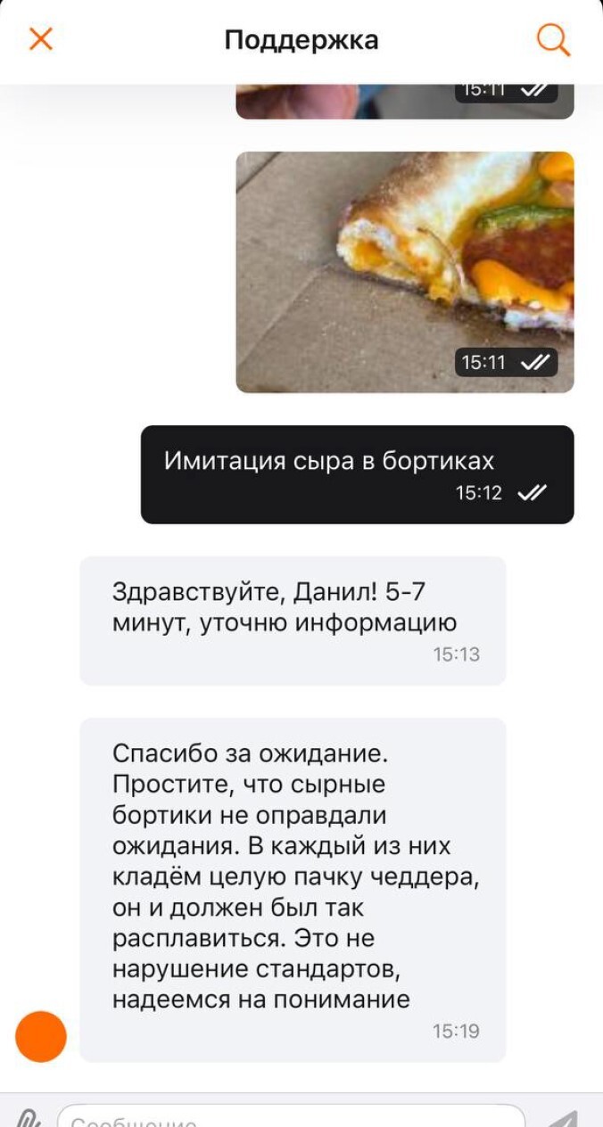Коротко изложу суть - кореш живёт в Сургуте, сделал заказ в Додо пицце на 9 касиков, а ему привезли низкокачественную подделку. Он хорошо разбирается в сырных бортиках и сделал аргументированное замечание, что они (бортики) не соответствуют заявленному качеству.