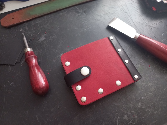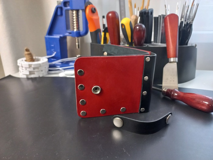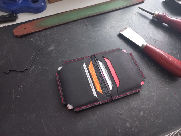 Долго расписывать сам процесс вообще не вижу смысла, все по 100500 раз уже выкладывали как они шьют, как режут, как клеят (говорит человек, который только что выложил такие же фотки), поэтому вот фото готового изделия, из-за довольно тонкой кожи на сгибе в 1.1мм, прошить было муторно, шов никак не хотел ложиться елочкой как раз из-за тонкости. Будем работать с этим вопросом.