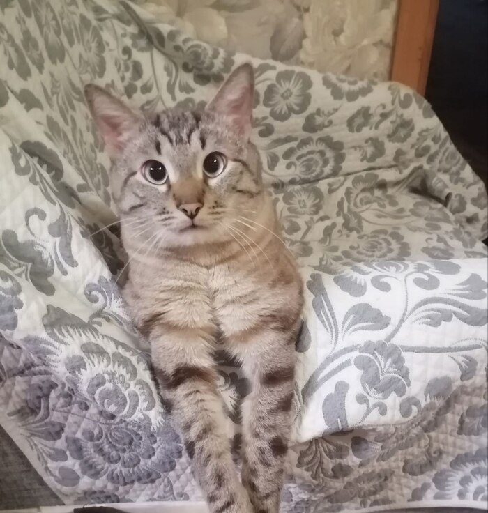 Он красивый, дымчатый в полоску с белыми усиками.