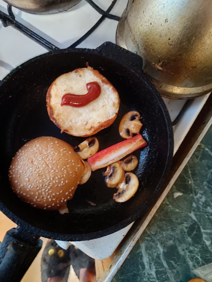 Взяла крабовую палочку, распечатала, кинула жариться. Также помыла большой шампиньон, порезала и кинула к палочке. Булочку для гамбургеров разрезала пополам, кинула румяниться. Перевернула булки, одну смазала кетчупом.