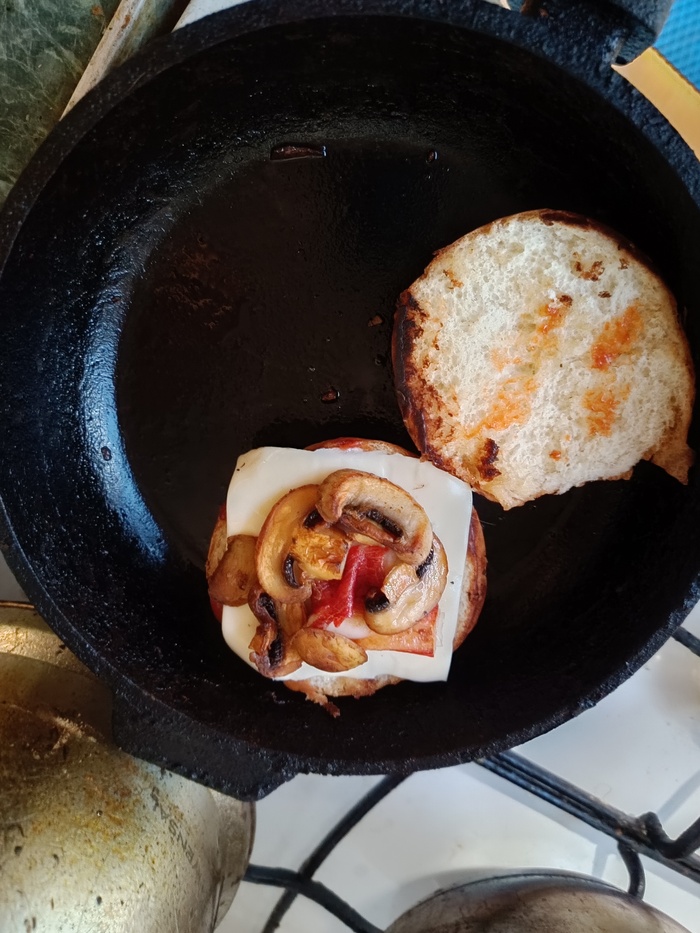 На смазанную булку кинула ломтик плавленного сыра, поджарившиеся грибы и крабовую палку.