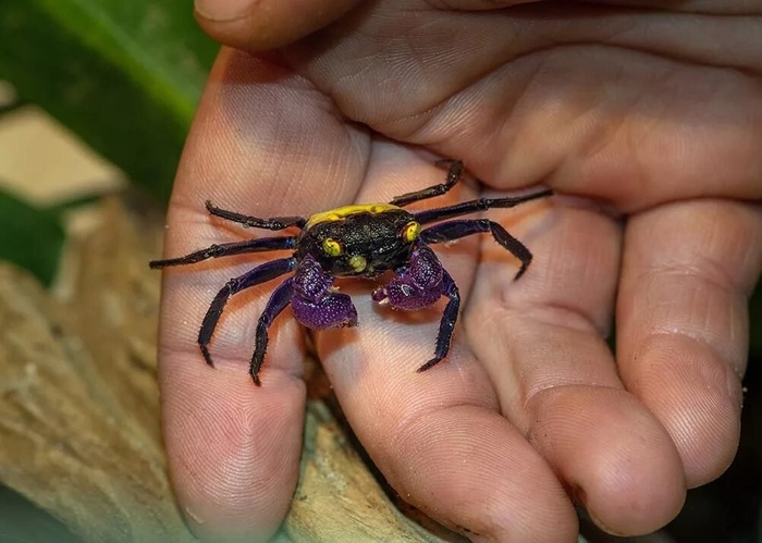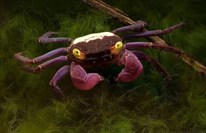 Есть на свете чудный краб с квадратным широким панцирем фиолетово-пурпурного цвета. Краба прозвали вампиром, хотя кровью он не питается. Просто на его панцире есть пятно в виде кремовой летучей мыши, сильно выделяющееся на фоне всего краба. Автор бы предпочёл дать этому ракообразному кличку "Бэтмен", но название ему придумали задолго до появления такого супергероя в комиксах.
