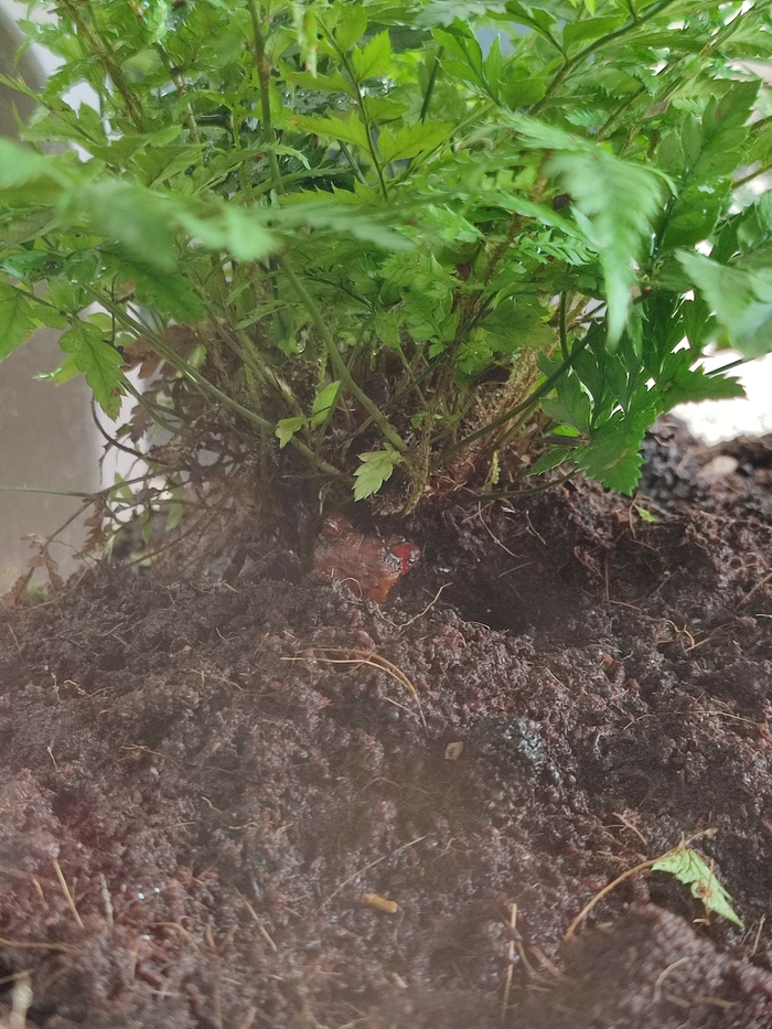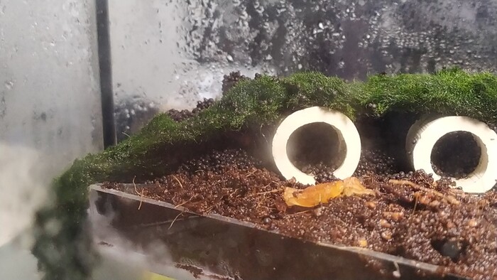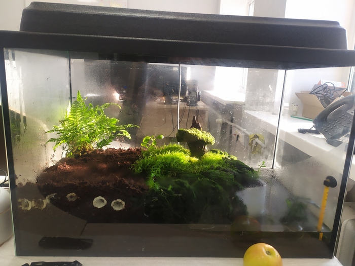 Итак продолжим. Отгородив часть дна пластиком был засыпан все тот же пропант( что оказалось ошибкой ведь он очень сыпуч) и сверху был сделан слой из косового субстрата. Крабы в нем делают горы и собственно добывают еду. Так же был прикуплен папоротник под которым быстро появилась норка с охранником
