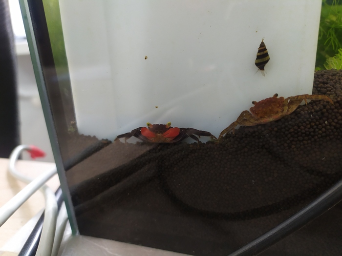 Итак, прошлым летом у меня появилось четверо крабов неизвестного полу. Данный вид крабов является преимущественно сухопутные, по этому крабам были сделаны острова для посещения суши. В водной части обитали креветки.