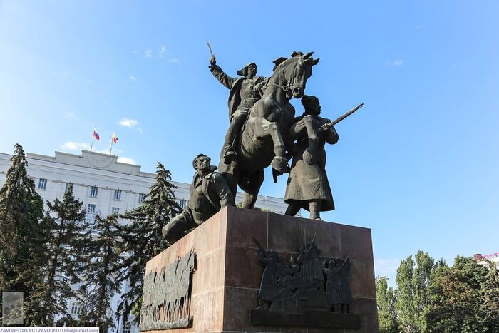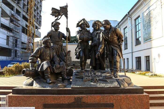 Памятник основателям крепости Св. Димитрия Ростовского. Скульптура включает фигуры целого ряда знаковых для Ростова-на-Дону исторических личностей – автора проекта крепости Дмитрия Ростовского военного инженера Александра Ригельмана и первого ее коменданта генерала-бригадира Сомова, атамана войска Донского Данилы Ефремова, сидящего на трофейной турецкой пушке, и сопровождающего его казачьего старшины с флагом, а также начальника Темерницкой таможни купца Хастанова.