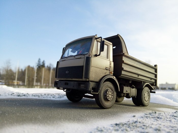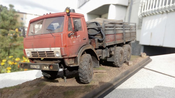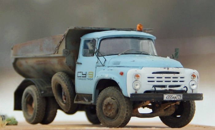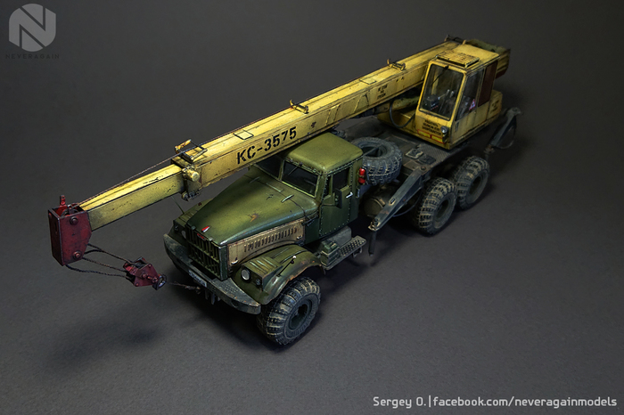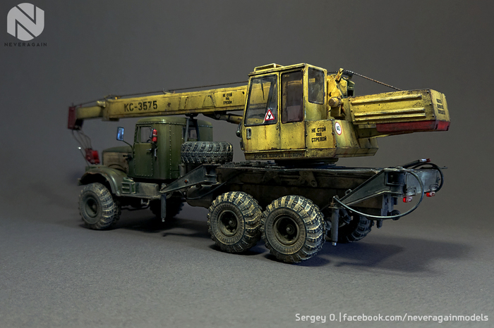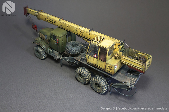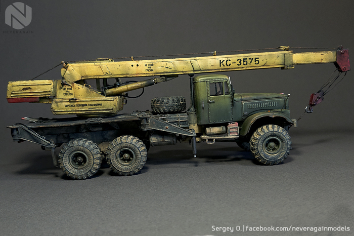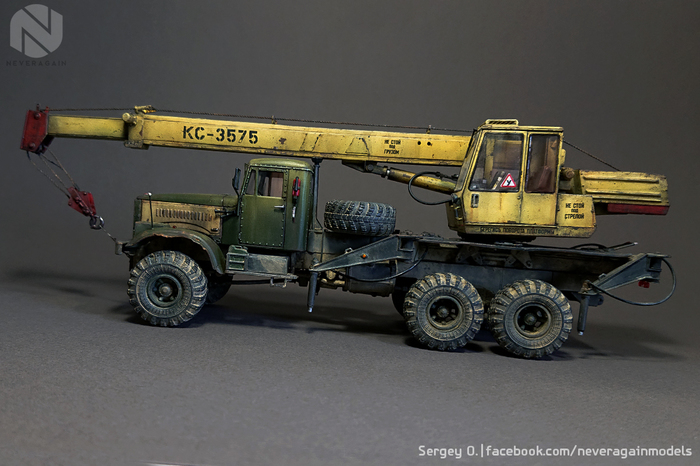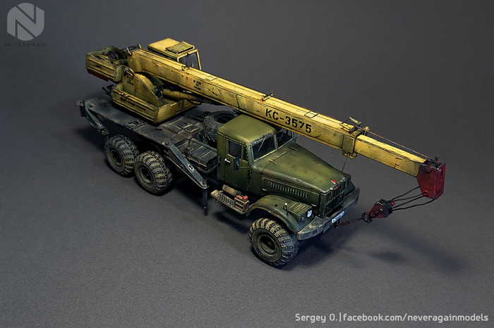 Вашему, друзья, вниманию, автокран серии КС, выполненный на базе старого доброго Лаптежника. Модель, выпущенная совсем недавно АВД, оказалась довольно "капризной" в плане как матчасти, так и самой "архитектуры" сборки. Главная беда - узкая колея. Производитель, похоже, не мудрствуя лукаво, просто положил во все КрАЗы раму и шасси от обычных, дорожных моделей. Пришлось колхозить, наращивая мосты по ширине. Времени ушло - вагон и тележка. В список доработок также вошли: замена габаритных усов на точеные, фар - на продукцию Эльфа, идущей в наборе ниточки - на трос, более подходящий по диаметру, установка какой-никакой гидравлики и т.д. и т.п. Окрас - акрилом, тонировка - всем подряд. Надеюсь, вам понравится!