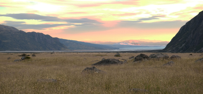 Картинно выпив вина (местного и довольно приличного) на фоне заснеженного Маунт-Кука, мы отправились прямо по равнине на вечернюю прогулку к ближайшим скалам. Солнце еще не падало за горизонт, и невозможно было просто сидеть на месте в таких пейзажах. Каменистая почва, редкие и яркие альпийские цветы, шуршание куропаток в траве и далекие розовеющие горы. На скале перед нами русла селевых потоков нарисовали трех изысканных женщин в вечерних платьях, беседу которых заглушал шум горной реки.