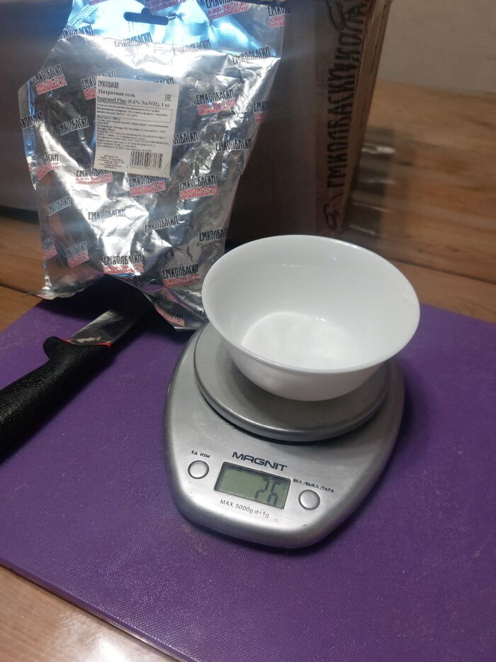 Для крупнокусковых ветчин я использую 20 грамм посолочной смеси на 1 килограмм мяса. Для других изделий я под свой вкус скорректировал эти грамовки расскажу о них в будущем. Предварительно взвесив мясо, мы можем узнать нужное количество соли.