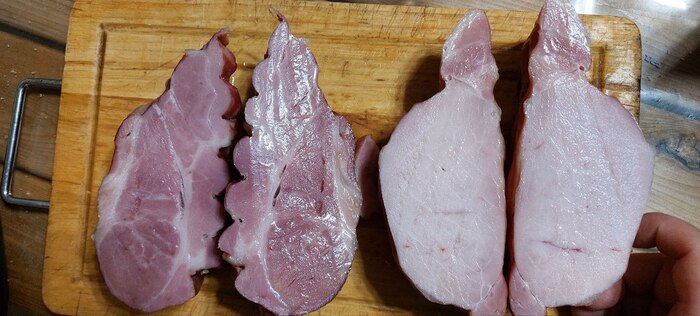 Обратите внимание на то какой бледный карбонад и какая яркая шейка. В шейке больше миоглобина, чем в карбонаде.