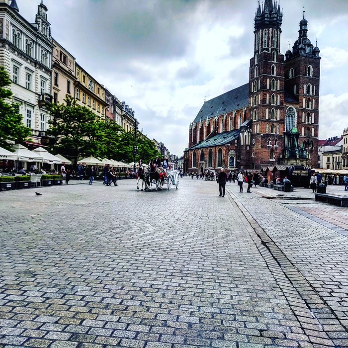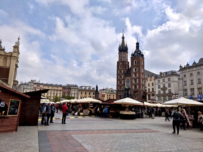 Центральная городская площадь, Главный Рынок – это действительно туристический рай. Здесь находится знаменитый Мариацкий костёл, история которого уходит чуть ли не в тринадцатый век. Понятно, что теперешнее здание гораздо более поздней постройки, но от этого оно выглядит не менее величественно и торжественно. Периодически площадь наполняется звуками трубы, доносящимися с одной из башен костела, и этот трубный зов отзывается в душе какими-то смутными ассоциациями.