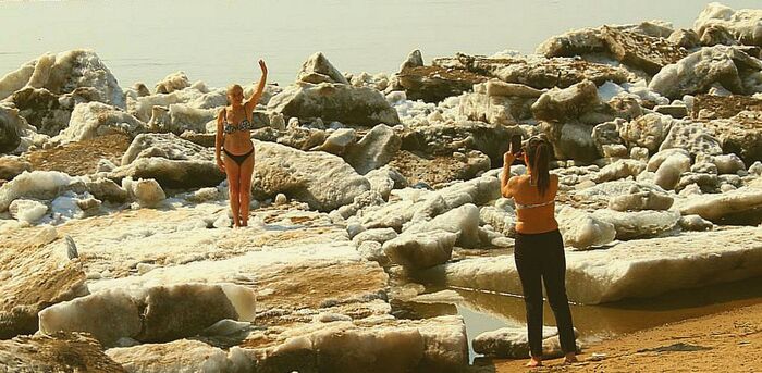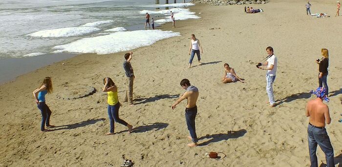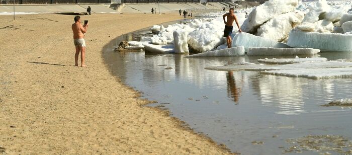 Из сапог в босоножки или, как говорят метеорологи, - Тепловая волна (Heat wave): В отдельные весенние дни под влиянием жарких воздушных масс с юга дневные температуры воздуха в отдельных континентальных регионах РФ могут подняться выше чем на турецких курортах. В связи с изменениями климата, т.н. Волны Россби (планетарные волны возникающие в атмосфере из-за вращения Земли и серьезно влияющие на погоду) могут приводить к экстремальным потеплениям. И вот на улице внезапно +30 С и народ не теряя времени начинает принимать солнечные ванны на фоне плывущих льдин и еще лежащих сугробов. Нагревшийся под ярким весенним солнцем и уже горячий песок соседствует с еще не успевшими растаять ледяными глыбами на берегу и грязными сугробами, а рыбаки в шапках - с загорающими в купальниках. Остатки ледяного панциря, такого прочного и незыблемого еще недавно, теперь беспомощно хрустят под напором проснувшейся стихии и жаркого солнца. Кто-то пытается открывать купальный сезон, а некоторые молодые дамы буквально еще вчера носившие куртки и сапоги, сегодня уже в одних майках и летних платьях весело лазают босиком по полурастаявшим льдинам, символизируя явную капитуляцию зимы...