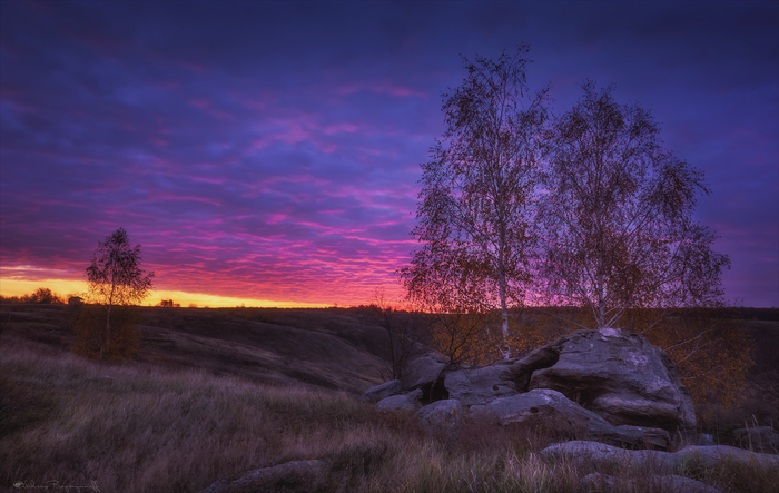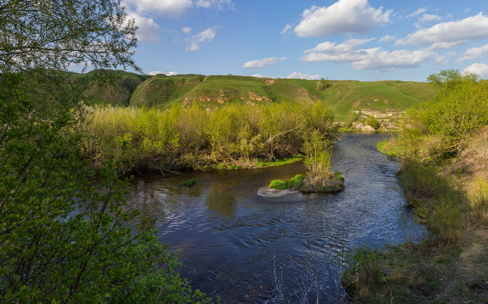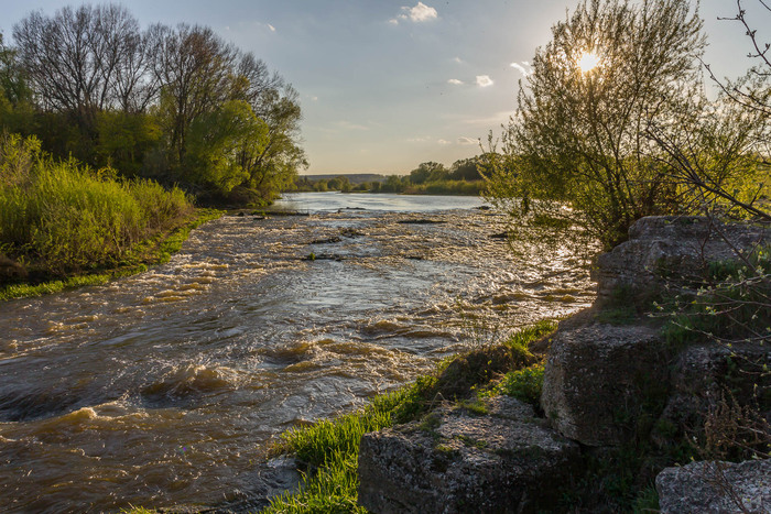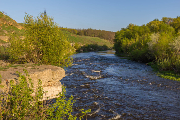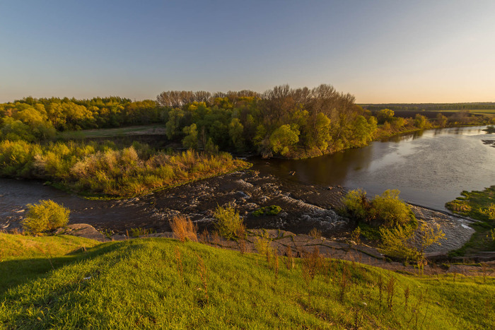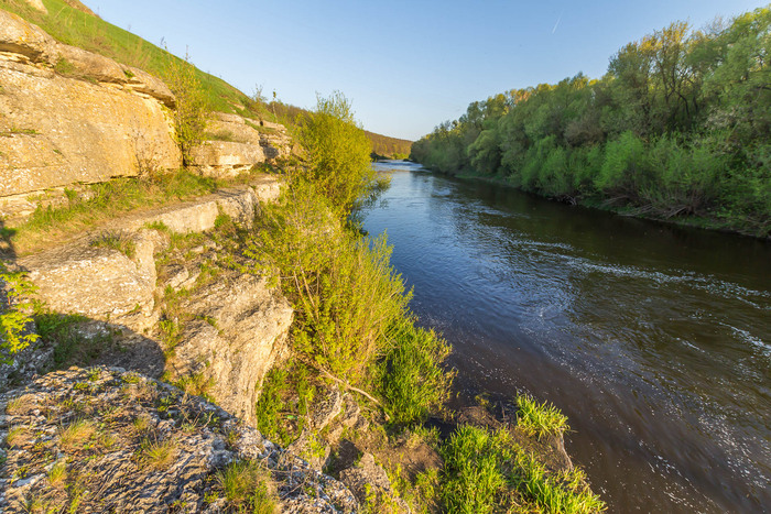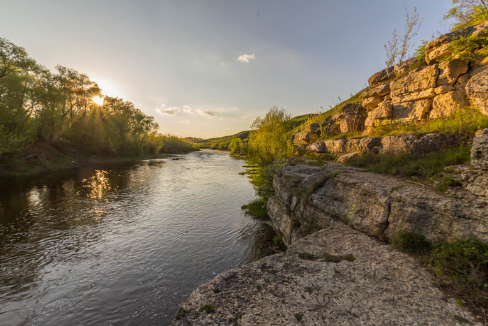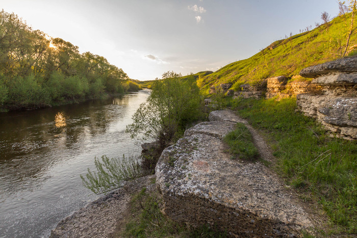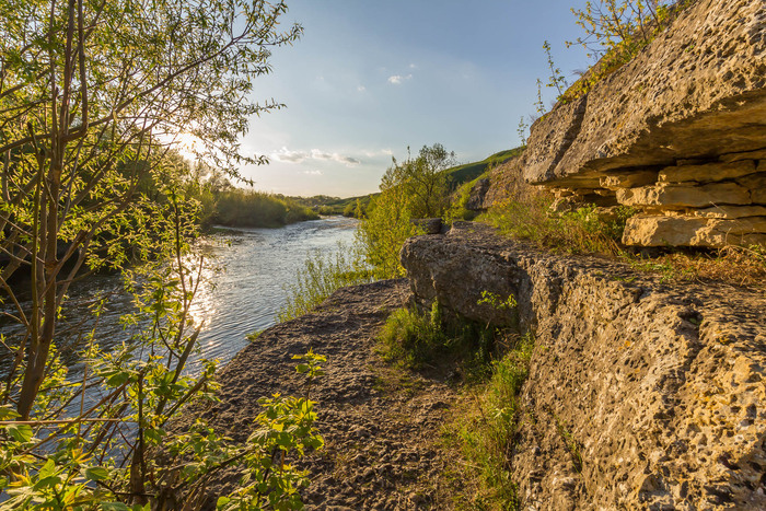 Скалы образованы выходами известняка и представляют собой небольшие террасы покрытые степной растительностью. Отличное место, чтобы побродить вдоль реки и полюбоваться закатом.