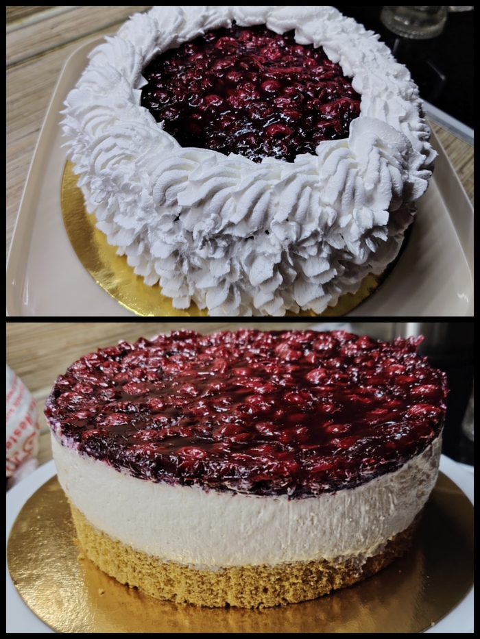 Ванильный бисквит, сливочное суфле и вишневое компоте.