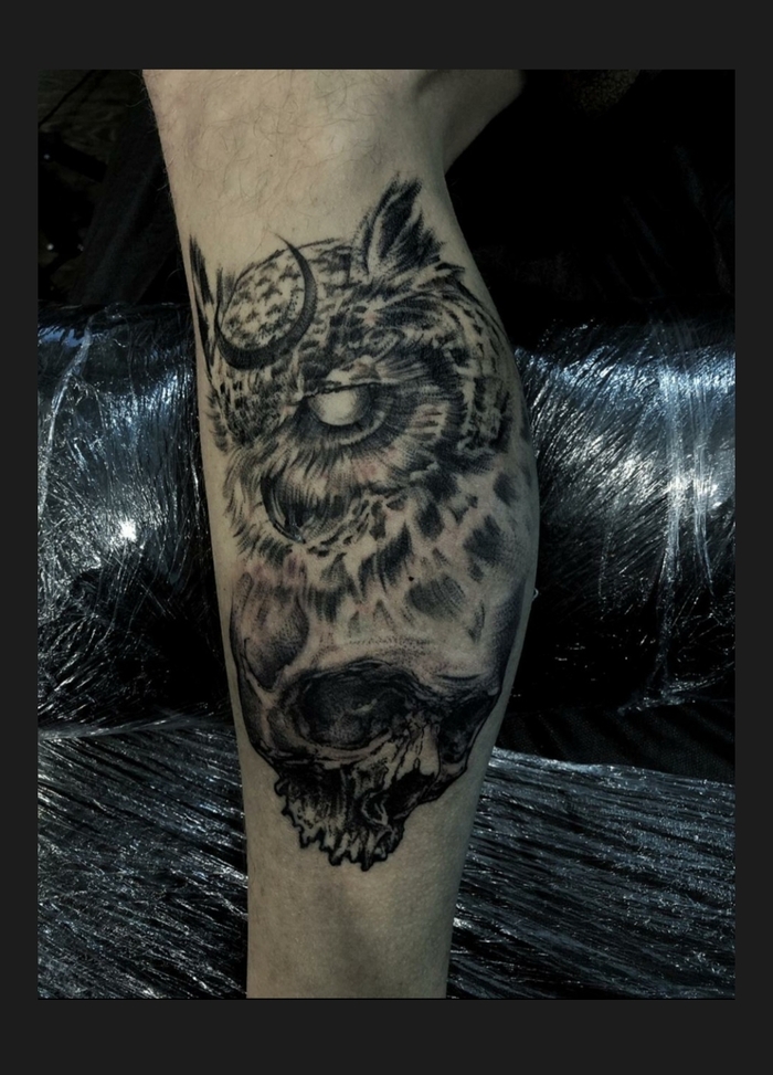 Парень хотел себе что-нибудь на ноге. Эскиз выбирали долго. Главная причина долгого поиска была не в капризности модели, а неуверенности Оли, что я "смогу". В итоге удалось уговорить ее на два эскиза - сову и череп, в стиле графика. Тут-то я уже разгулялся. 3 сеанса и вот она, моя еще одна татуировка, на человеке :)
