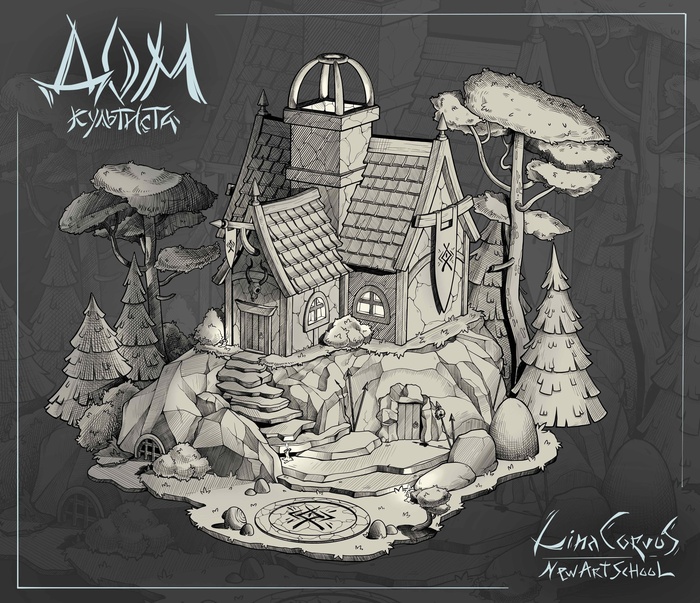 Тоже кое-что из учебного. Многострадальный дом, который был зарисован, потом полностью слеплен как 3д модель в Блендере, и снова отрисован, но уже ровно и красиво.