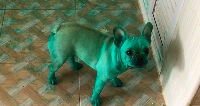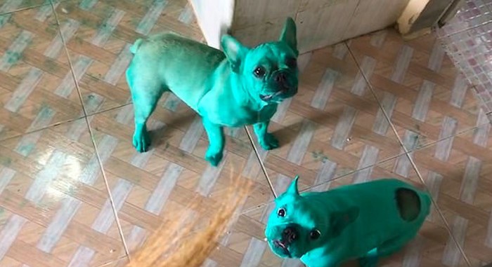 Заводчица собак из Таиланда поделилась видео, на котором двое из её французских бульдогов превратились в инопланетных монстров. Ночью животные забрались в кухонный шкаф с зелёным пищевым красителем и самостоятельно изменили цвет своей шерсти. Да так радикально, что не снилось даже звёздным стилистам.