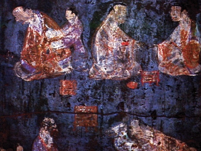Синий и пурпурный – твёрдые пигменты, которые можно сделать из натуральных материалов. Хань пурпурный создаётся путем смешивания молотого кварца, минерала бария, меди и свинца в точных пропорциях и нагревания их примерно до 1000 градусов по Цельсию. Учитывая тепло и ингредиенты, использованные при его создании, кажется вероятным, что хань пурпурный был побочным продуктом стекольного производства, но как именно его изобрели, всегда будет загадкой.