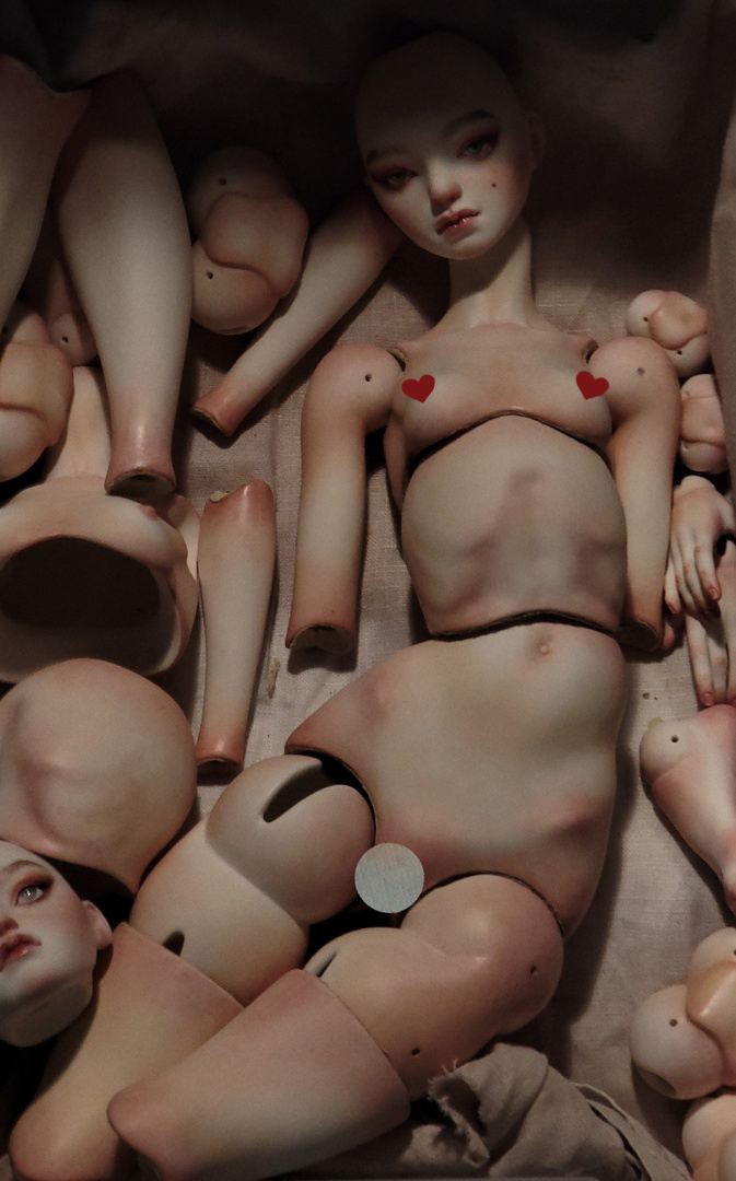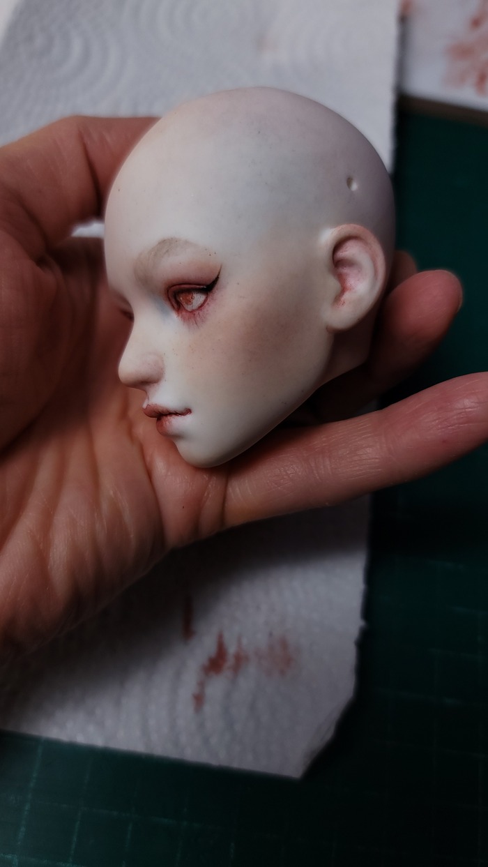 В первой части я остановилась на росписи фарфоровых деталей. До собранной куклы было ещё очень, очень далеко. Я не знала, насколько. Если бы я знала, но я не знала. Открытие первое - роспись бисквитного фарфора оказалась отчасти похожа на работу плохой акварелью по плохой бумаге. Открытие второе: готовая среда из магазина (жидкое связующее, на котором нужно замешивать надглазурную краску) дала безобразное количество чёрных точек при обжиге. Пораженная до глубины души открытием №2, я начала искать связующее, которое будет вести себя как-то поприличней. Купила эфирных масел и скипидара и сделала открытие №3: сандаловое масло даёт даже не точки, оно даёт равномерное пятнистое покрытие детали серого цвета. Дальше уже было поспокойней. Выпаренный скипидар проявил себя вполне прилично, лимонное масло похуже, лаванду я даже не пробовала, а масло чайного дерева оказалось идеальным. На нём я и остановилась. Воняет, конечно, но роспись на нём хороша.