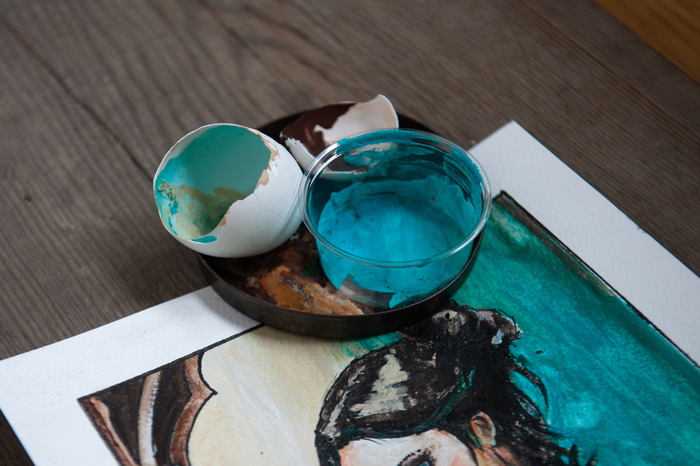 Если с созданием акварели справится любой дэбил, то с темперой справится даже тупой друг того дэбила. Поэтому темпера. В яичный белок добавляем немного уксуса и взбалтываем, пока не станет жидким. Дальше мешаем с пигментами. Готово. Проще только масло.