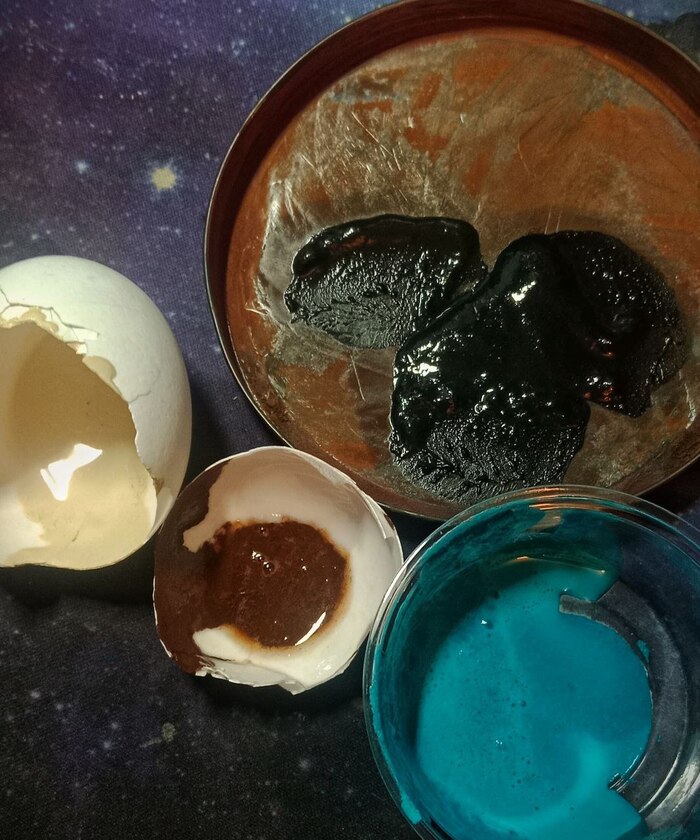 Всё, хватит пока что. Чёрный можно получить из железного купороса. Или зафигачить ржавую водичку в медный купорос - тут же выпадает черно-коричневый осадок. Но я взял просто уголь, потому что ну короче.