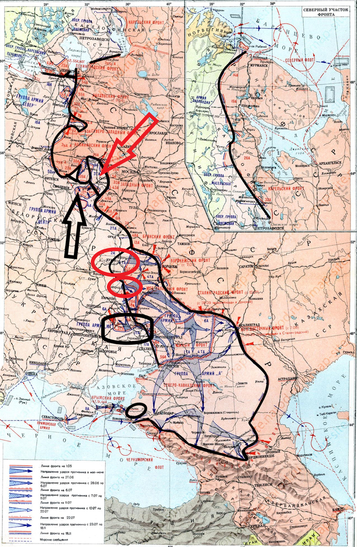 На картах красными стрелками обозначены основные удары советских войск, чёрными немецких и их союзников, голубыми направления основных событий на других театрах военных действий, жёлтыми границы отвоёванных территорий при наступлении той или другой стороны.