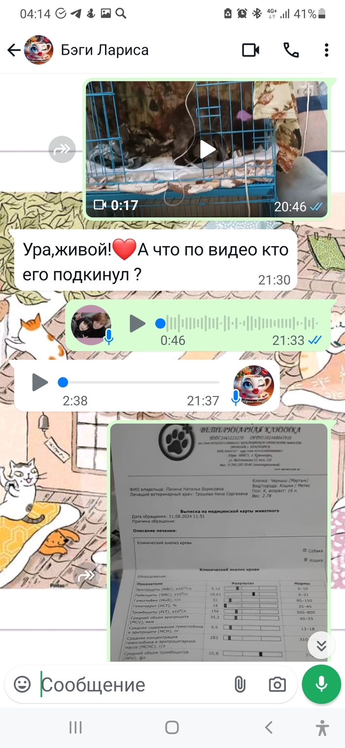 Кота достали из дыры в асфальте...практически в бессознательно состоянии. Увезли в Акеллу ( ветклиника ). И написали нам..