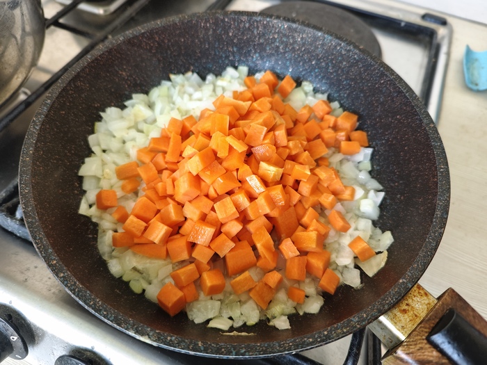 3. на сковороде пассировать лук до золотистости, затем к нему добавить порезанную на кубики морковь. Пожарить еще 5-7 минут до легкой готовности моркови.