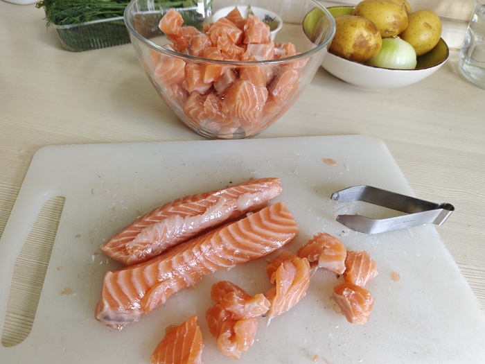 4. Нарезаем основную рыбу (филе) на кубики 2 см (хребет от нее тоже можно использовать в суповом наборе для бульона). Удаляем все кости – удобно с помощью специальных щипцов для рыбных костей.