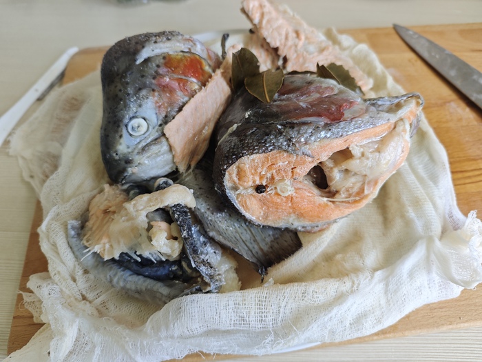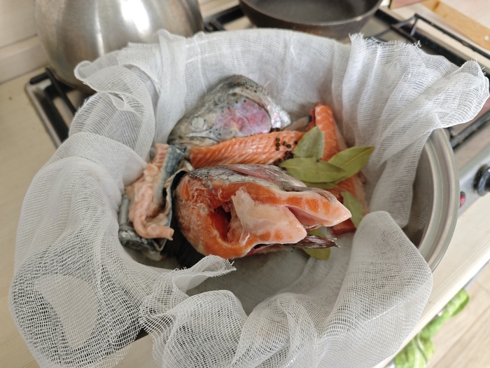 Лайфхак: варить в марле удобно, потому что потом не надо будет ничего вылавливать и процеживать бульон. Все кости, чешуя и пр. останутся в сетке и не попадутся потом в тарелке.