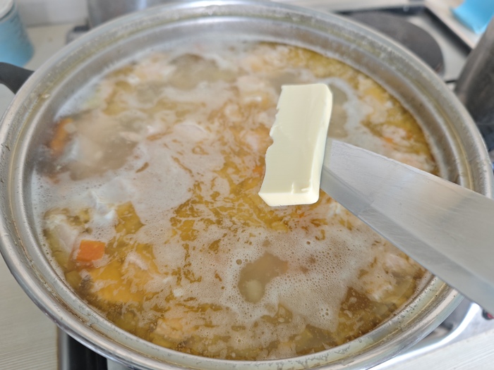 8. Добавить сливочное масло и сливки, довести до кипения, но не варить! Тут же выключить плиту.
