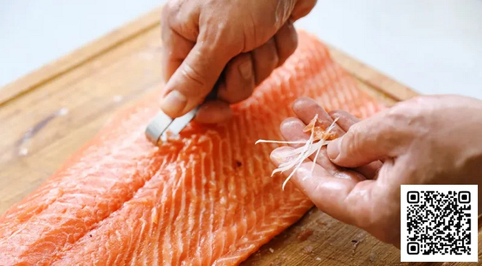 Отрежьте 5 плавников: три — с брюшка горбуши, два — со спины. На обеих половинках по всей длине рыбы отрежьте оставшиеся длинные реберные кости, аккуратно поддевая их ножом. Теперь немного ювелирный работы. Здесь вам пригодится пинцет. Нужно вынуть все косточки, которые «спрятаны» вдоль хребта.