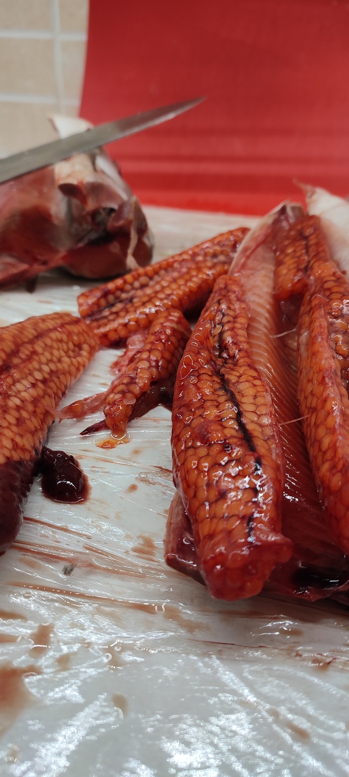 Я купил 4 рыбины и 3 из них были с икрой. Вся рыба целиком вышла в 828 рублей (3.45кг×240р), из неё получилось выделить 300 грамм готовой икры (изначально было 400, но пока отделял, пока промывал и солил уменьшилось так), которую успешно получилось засолить! Первый раз в жизни делал это и успех! Правда не вся плёнка отделилась, но и пофиг, так как эта икра даже вкуснее покупной..