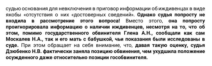 О данных нарушениях мной было сообщено в жалобе в Генеральную прокуратуру, а также поставлен вопрос о внесении надзорного представления на вынесенный приговор. Жалоба была направлена для рассмотрения в Прокуратуру Московской области. Однако, жалоба была рассмотрена формально, ее ответы не соответствуют имевшим место обстоятельствам и не соответствуют требованиям закона, более того, большая часть доводов была проигнорирована и не получила ответов. Соответственно, в данной части жалоба даже формально не рассмотрена. По ряду вопросов ответ содержит дезинформацию, как, например, в том, что у Москалева Н.А отсутствуют лица, находящихся на иждивении.