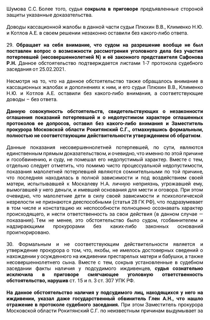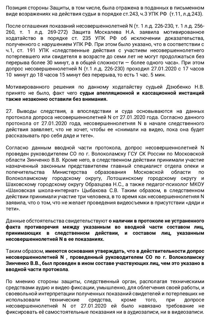 17. Судебная коллегия, вместо того, чтобы выявить и устранить допущенные нарушения, напротив, прикрывая их, в своем определении допустила просто не соответствующие действительности формулировки. Так, на листе апелляционного определения 9 указано: «Не заслуживают доверия и доводы Москалева Н.А. о том, что Сафонова М.Н. с дочерью фактически проживали в квартире в г. Москве». Вместе с тем, ни Москалев Н.А., ни сторона защиты никогда не утверждали, что Сафонова со своей дочерью проживали в Москве период с сентября 2019 по январь 2020 г. Таких формулировок не содержится ни в протоколах допросов Москалева Н.А. на стадии следствия, ни при даче им показаний в суде, более того, ни в одном документе уголовного дела! Таким образом, суд апелляционной инстанции вновь допустил голословные, немотивированные утверждения.