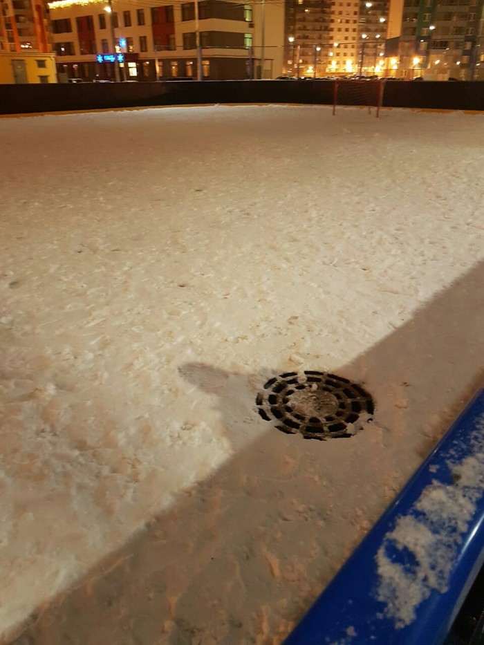 В Санкт-Петербурге в новом микрорайоне "Новая Охта" к зиме для детей сделали замечательный подарок - хоккейная коробка... на которой этой зимой на коньках смогли бы кататься сотни ребятишек, но как оказалось ее установили в месте пролегания коммуникаций где просто нельзя строить спортивные площадки!