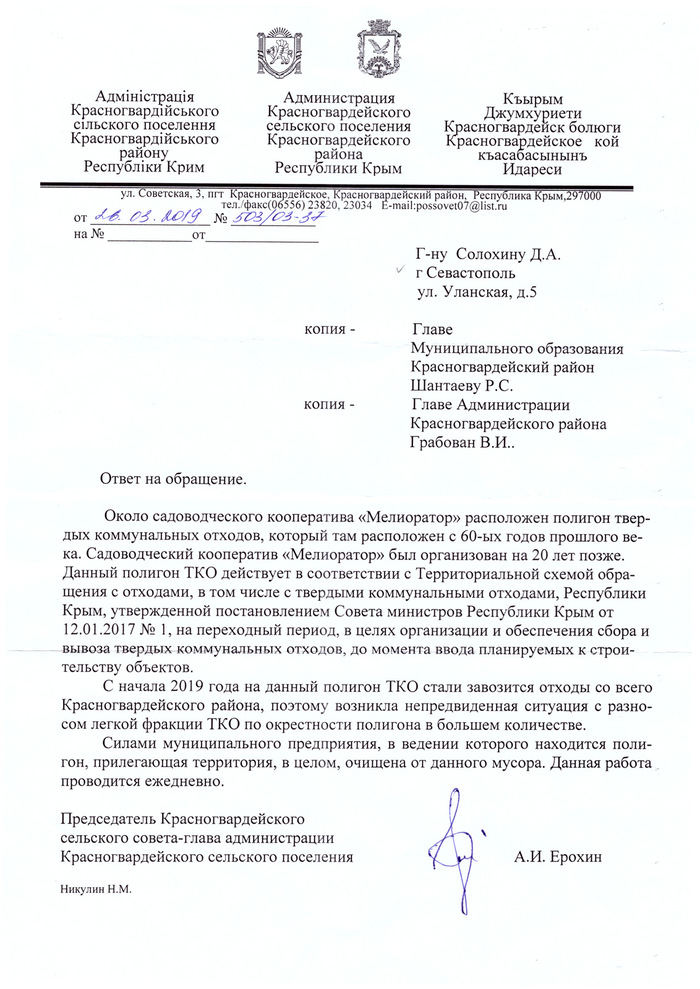 2. Пришёл ответ от председателя Красногвардейского Сельского совета-глава администрации Красногвардейского сельского поселения - А.И. Ерохина (фотокопию прикрепил):